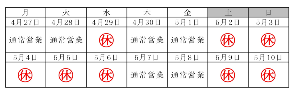 さて、当協会では誠に勝手ながら下記の期間をゴールデンウィーク休業とさせていただきます。